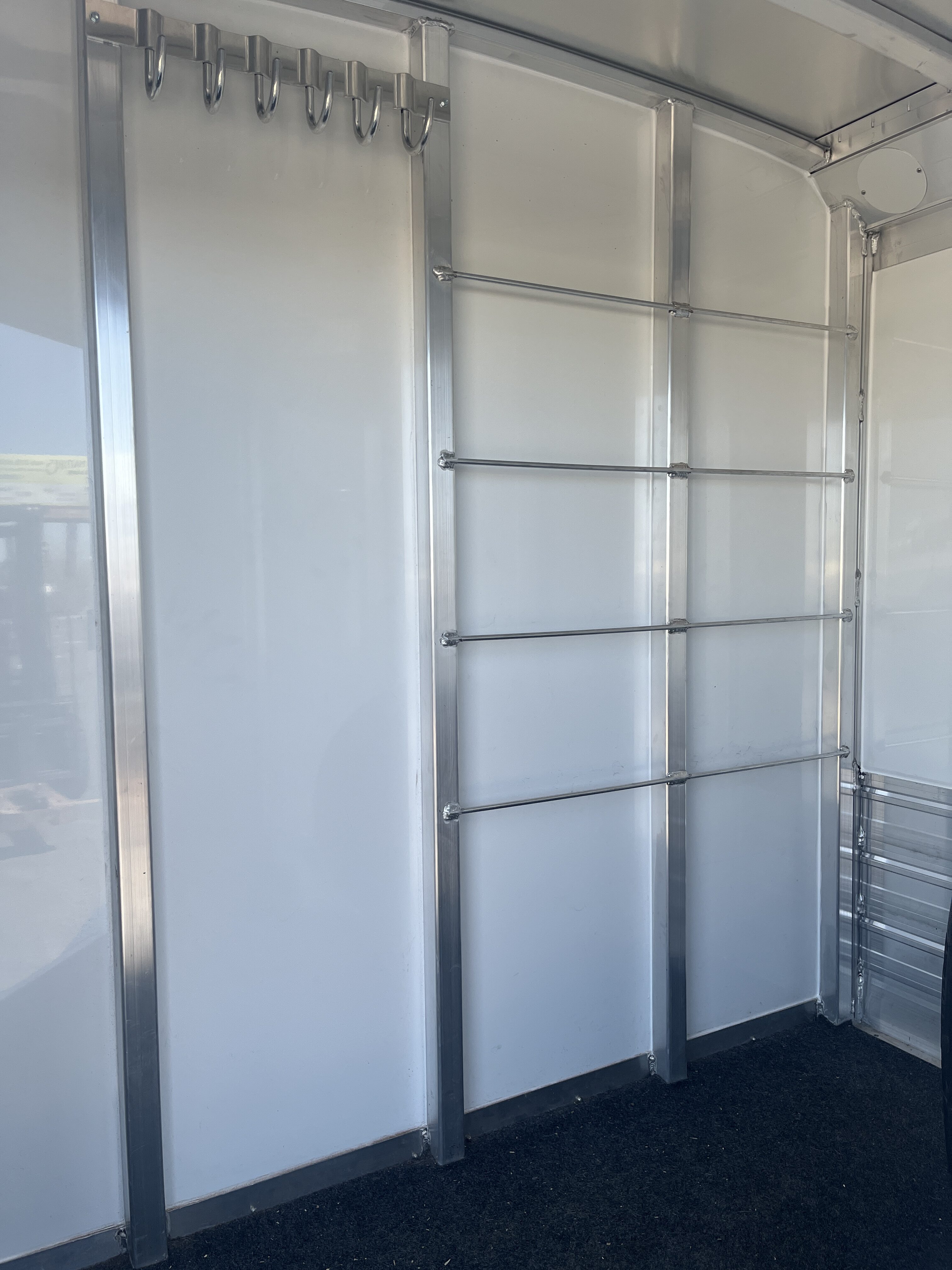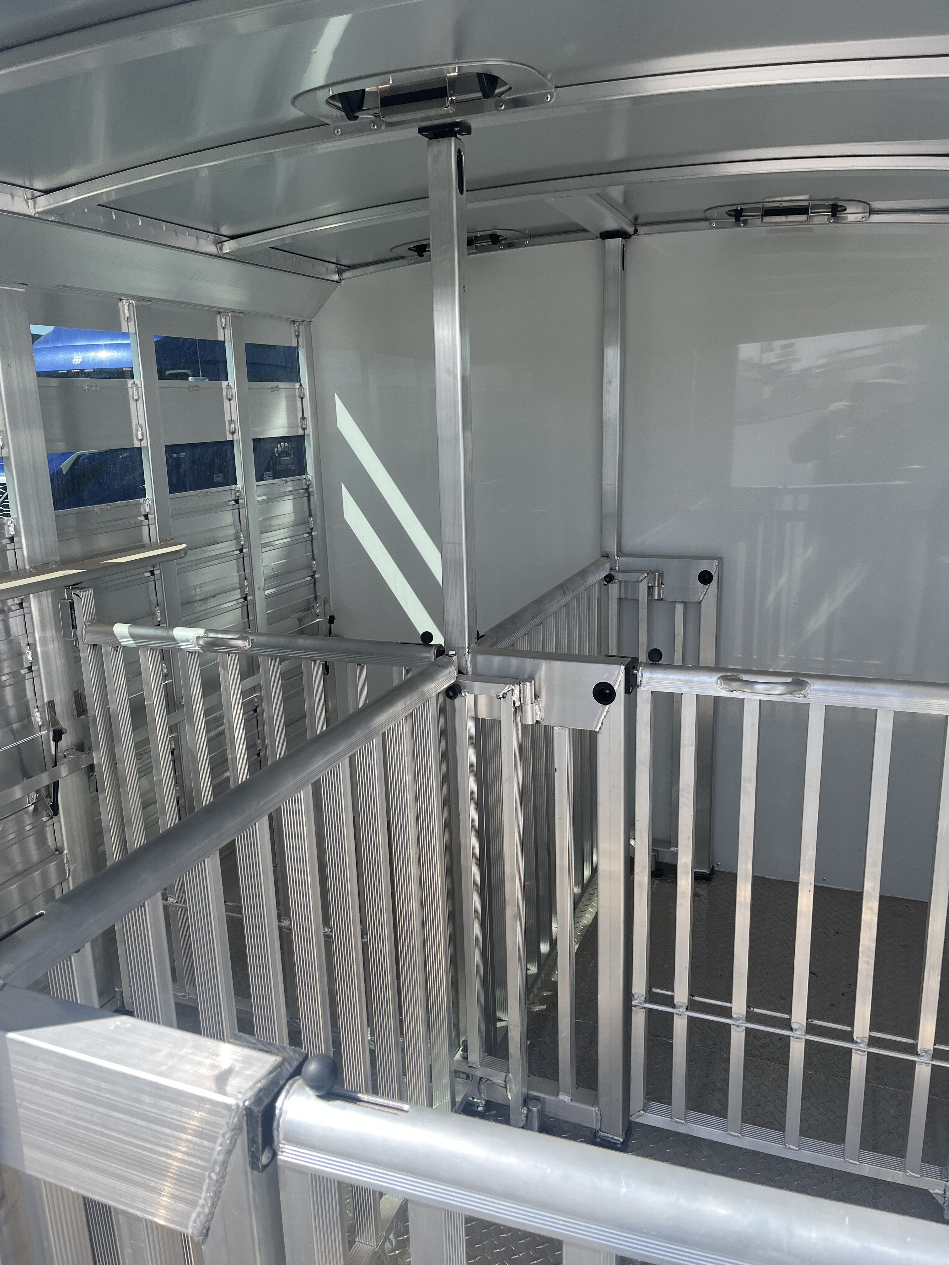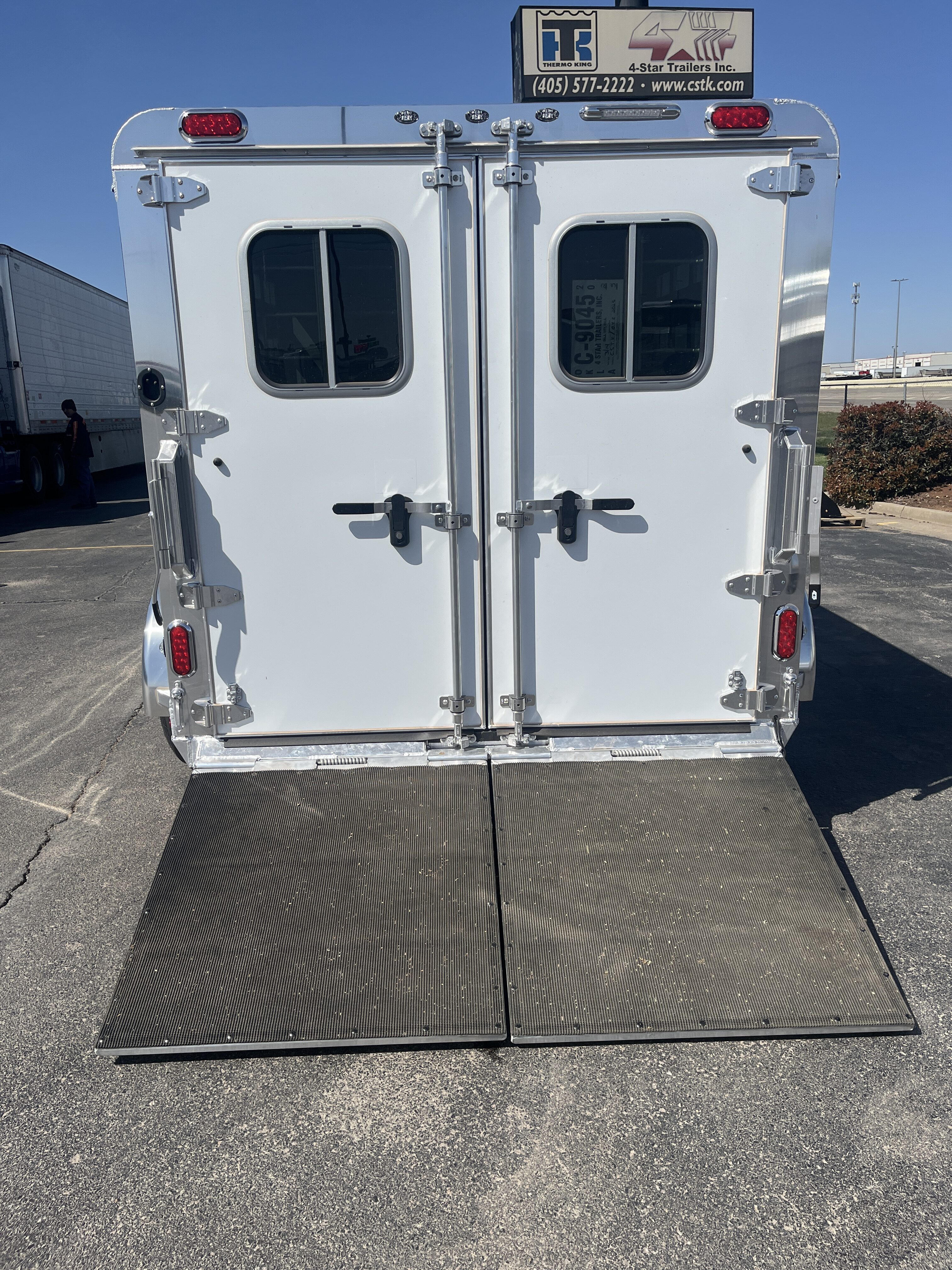 Front tack area, 2 air spaces with plexiglass, lower fold down air crack, 4 - adjustable pen system, 50/50 rear doors and full width rear ramp.